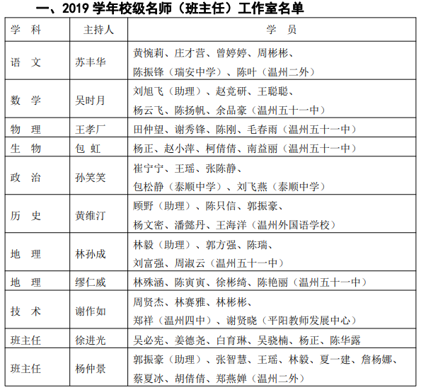 关于公布 2019 学年温州中学校级名师(班主任)工作室暨师徒结对名单的通知