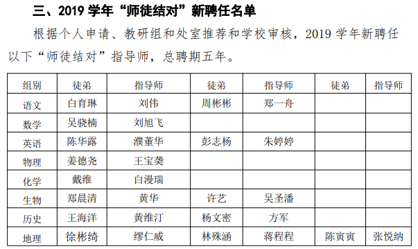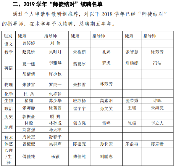 为了进一步落实学校“十三五”教育发展规划,研究新课标、新教材,适应新高考;达成温州中学师资分层培养目标,促进学科组人才梯队培养。经研究,公布 2019 学年温州中学校级名师工作室暨师徒结对名单。