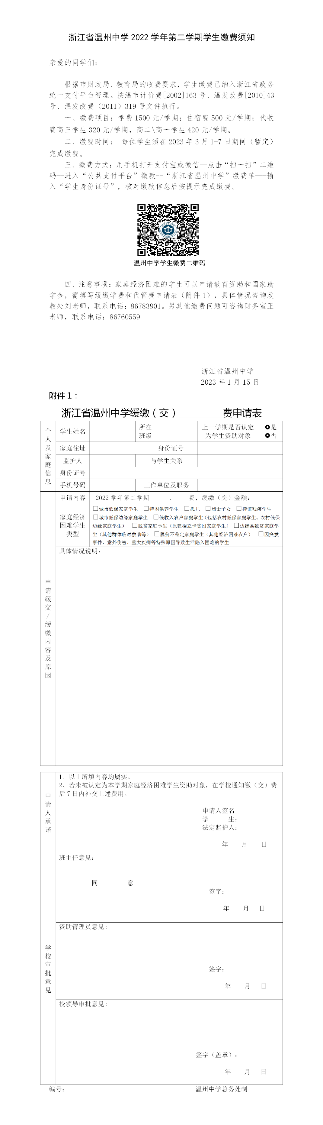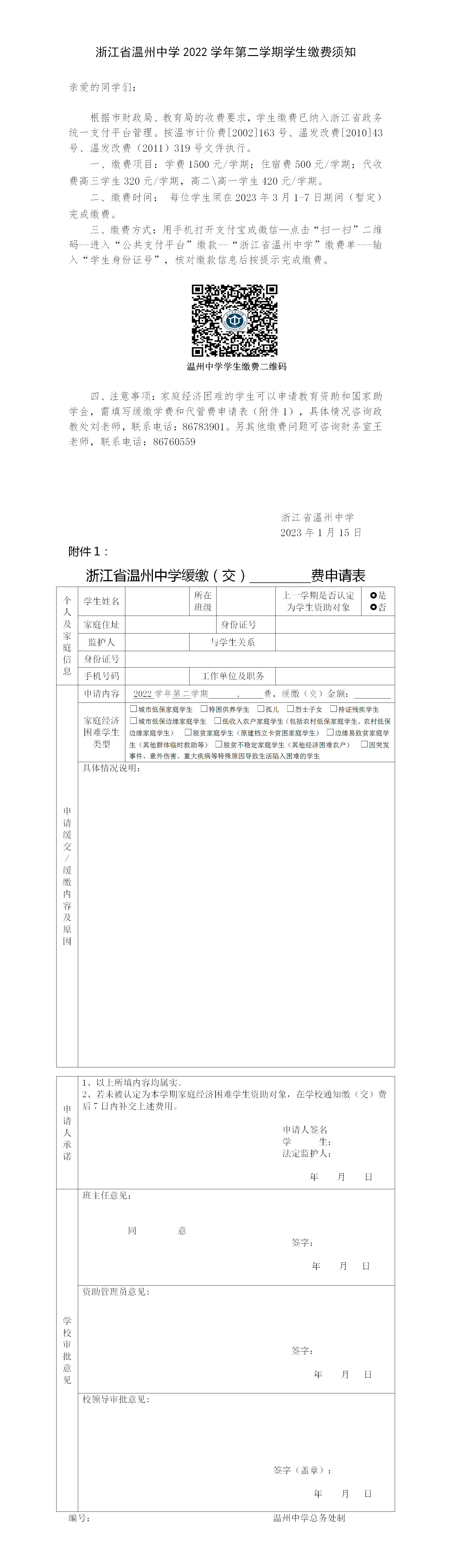 浙江省温州中学2022学年第二学期学生缴费须知---总务处--修改2023.1.14.docx